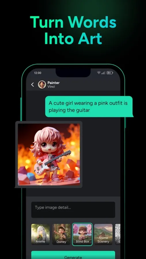 Turn words into artworks using the power of AI! All you need to do is enter a prompt, pick an art style - and watch WiseMate bring your idea to art in seconds. WiseMate lets you create beautiful AI-generated art, whether you like bold and colorful manga-style filters, intricate anime drawings, or realistic photorealistic images.