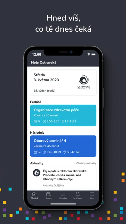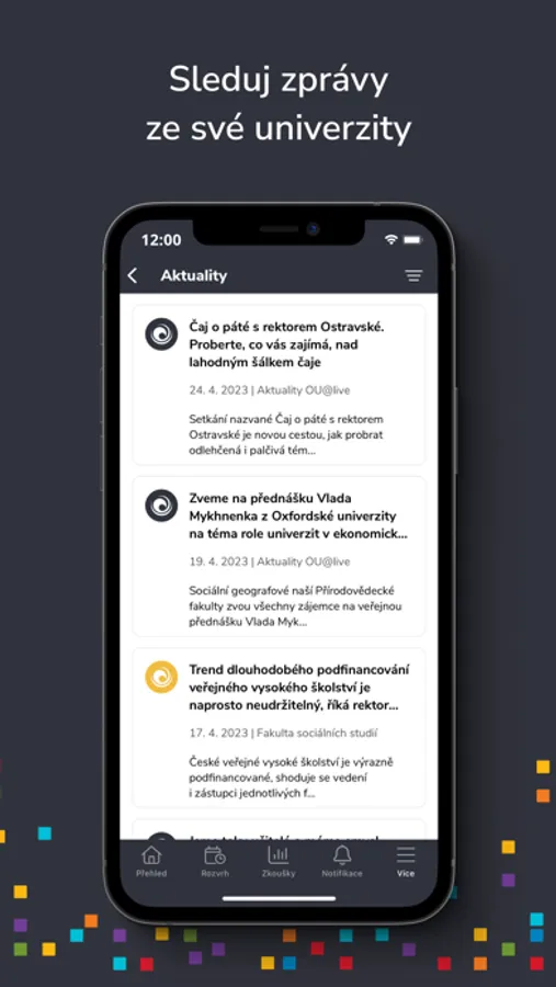 My UO is the official mobile app for students and teachers of University of Ostrava. App gives you detailed overview of your studies including a well-arranged timetable, exam date schedule or interactive map of the university buildings locations. You can enroll or withdraw from exam date anytime. Also, you will get a notification once exam result is published in IS/STAG or even when there is a vacant spot within an exam date. Thanks to news and notifications you will also be informed about university events and venues so you can keep up with UO’s vibrant community.