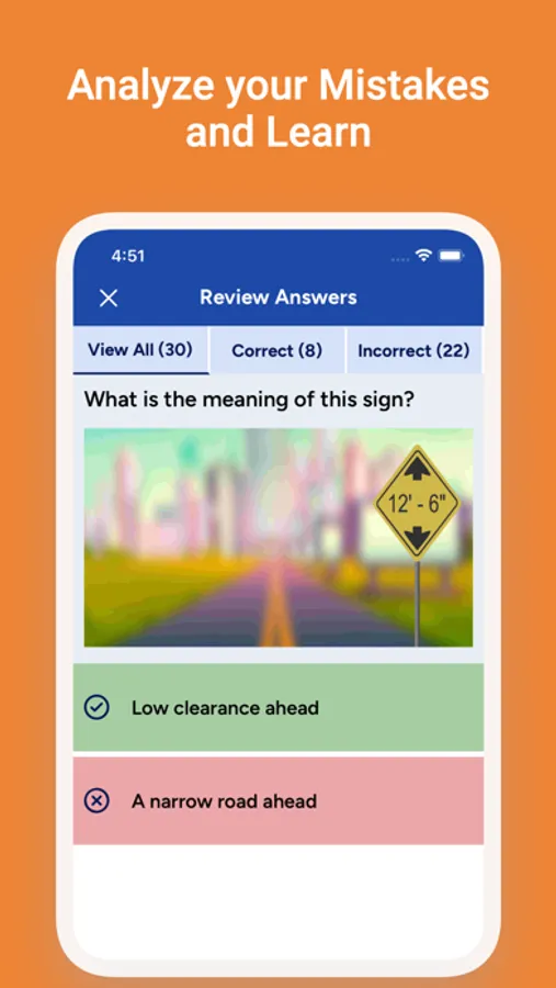 You will get the test result based on the official criteria to pass the Driver’s License Test. You will also be able to find out what questions you've done wrong after taking the test.