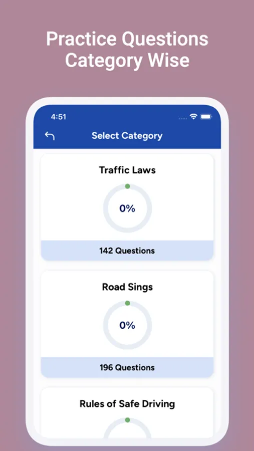 The app includes a practice module that allows to get familiar with questions that fall under different categories like Traffic Rules, Road Signs and Rules of Safe driving. It also keeps track of the progress you have made in each category. It contains questions from following categories: