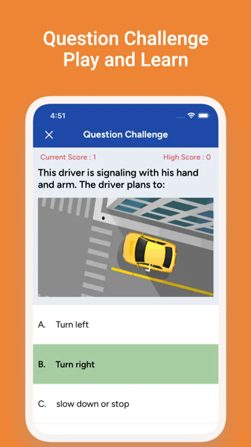 This is a unique feature of our application. It allows you learn while playing a challenge game. Your score will go up by one point each time you correctly answer a question up until the point where you get it wrong. It keeps record of your high score.