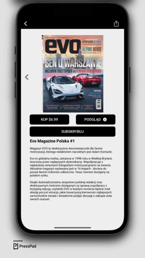 Magazyn EVO to ekskluzywny dwumiesięcznik dla fanów motoryzacji, którego redaktorem naczelnym jest Adam Kornacki. Evo to globalna marka, założona w 1998 roku w Wielkiej Brytanii, tworzona przez najlepszych dziennikarzy. Współpracuje z najbardziej cenionymi fotografami motoryzacyjnymi na świecie. Aktualnie magazyn wydawany jest w 16 krajach - dociera do ponad dwóch milionów odbiorców. Teraz również dostępny na polskim rynku. Dzięki doświadczonemu zespołowi polskiej redakcji oraz ekskluzywnym treściom dostępnym za sprawą współpracy z brytyjską edycją, czytelnik EVO w każdym numerze będzie miał okazję poczuć emocje, jakie towarzyszą kierowcom najlepszych samochodów świata i świadomie podjąć decyzję o zakupie auta swoich marzeń.