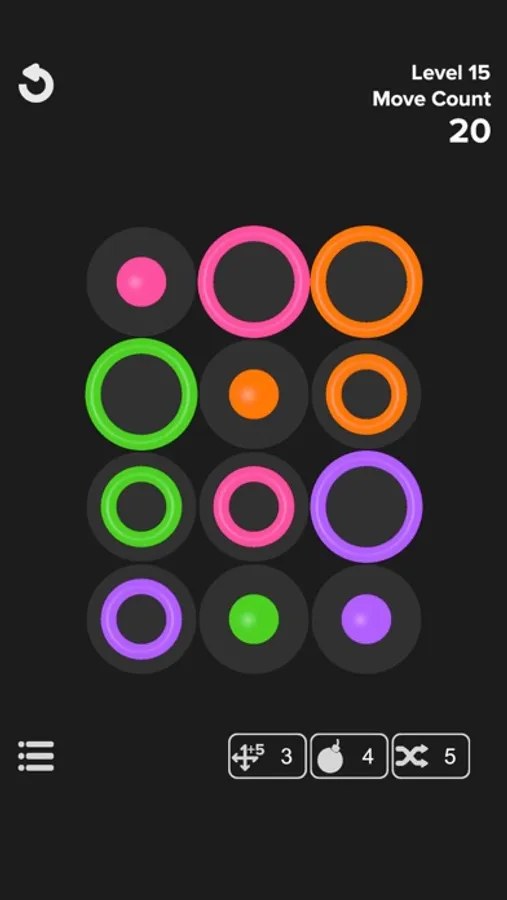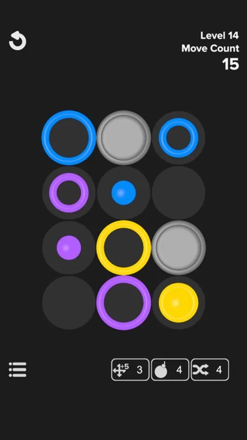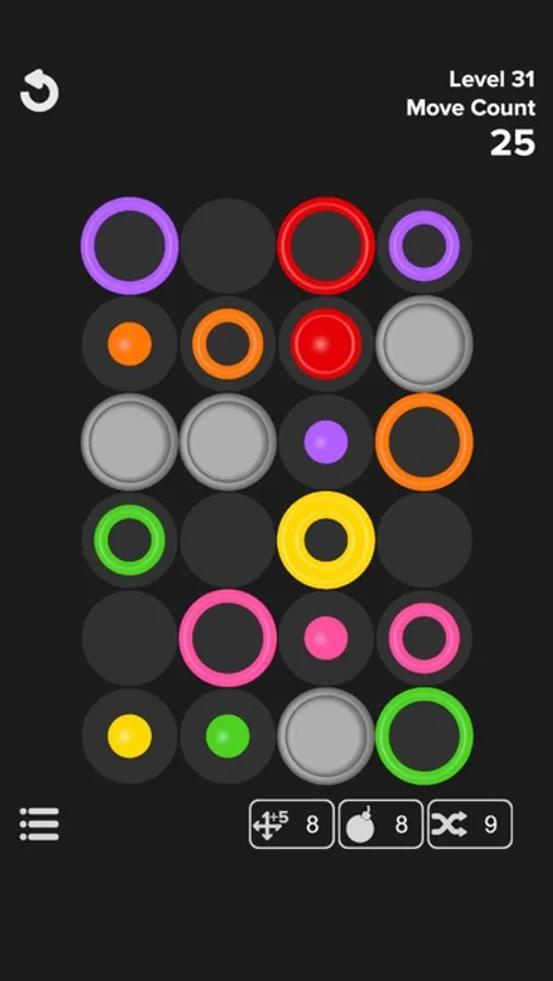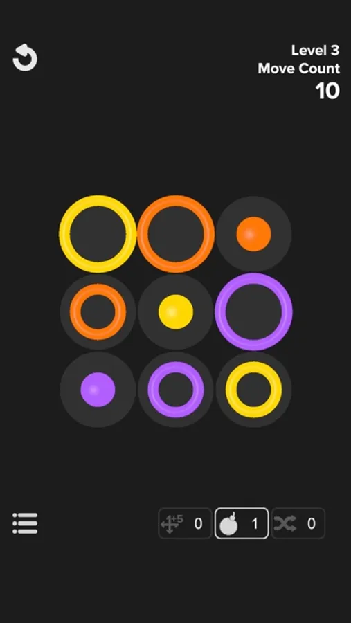 Simply swipe to move rings on the board. Arrange them to fit one within the other. Stack three rings of the same color. Match them all and clear the board. Watch your move count.