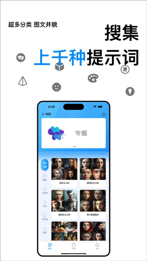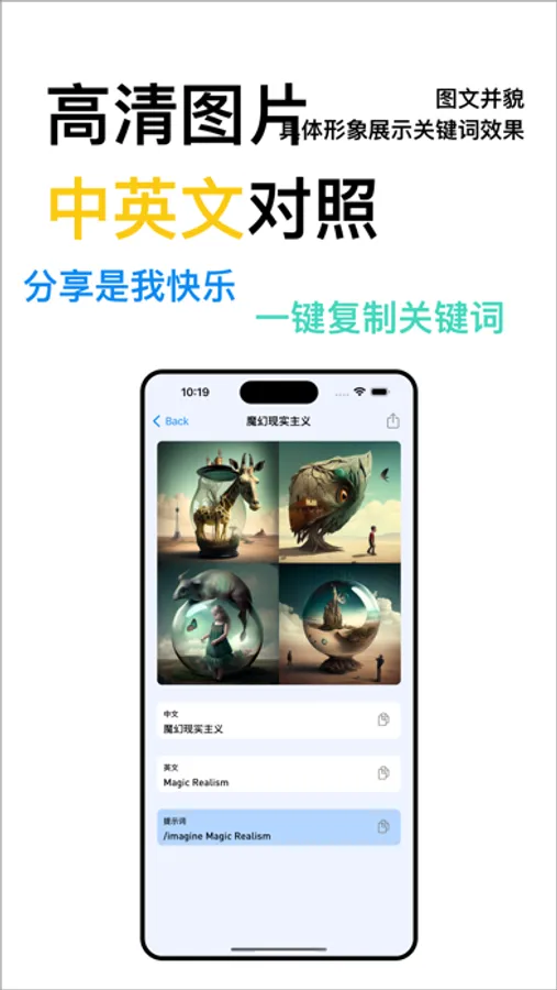 每个种类都有详细的配图,以及中文和英文的对照Prompt,您可以与朋友分享,也可以分享您喜欢的Prompt。
