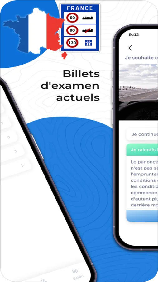 Apprentissage : l'application propose un ensemble complet de tests actuel pour l'apprentissage du code de la route. Les utilisateurs pourront apprendre divers aspects de la sécurité routière, notamment les panneaux, les marquages, les priorités, les virages, les limites de vitesse et bien plus encore.