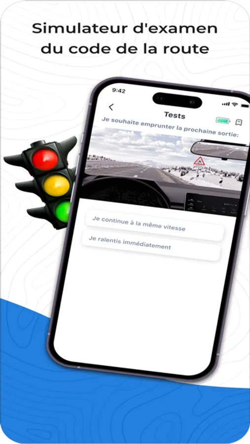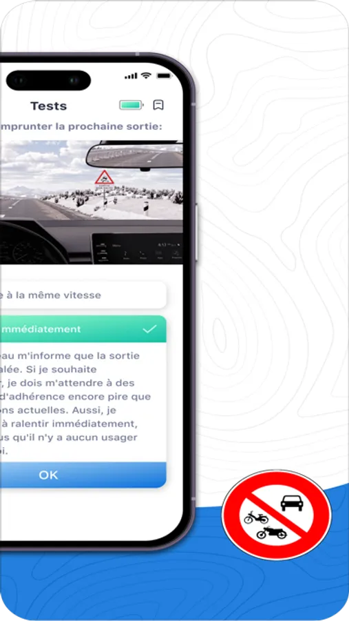 Tests interactifs : après avoir appris les règles, les utilisateurs peuvent passer une série de tests interactifs pour vérifier leurs connaissances. Les tests proposent une variété de questions et de situations que vous pourriez rencontrer sur la route.