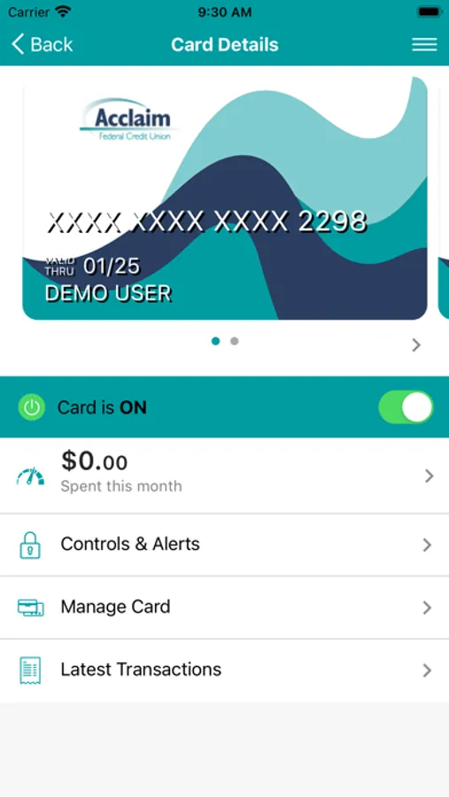 "Acclaim FCU CardNav helps you protect your Acclaim debit and credit cards by sending you transaction alerts and giving you the ability to choose when, where and how your cards are used.