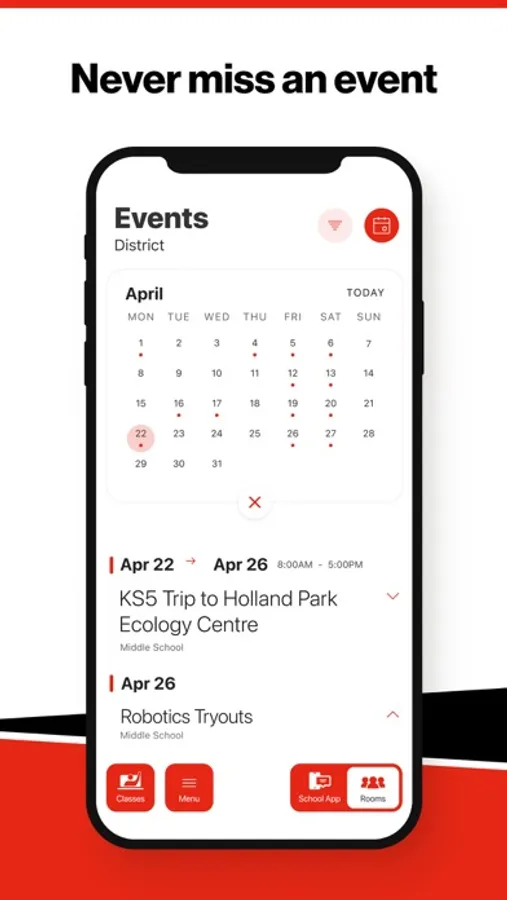 The event section shows a list of events throughout the district. Users can add an event to their calendar to share the event with friends and family with one tap.