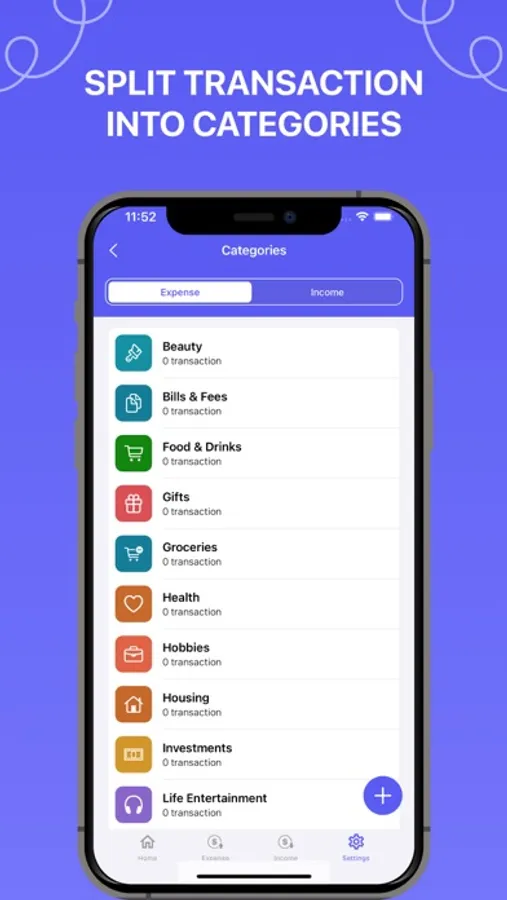 The app provides you with 13 categories for spending and 5 for income, as a starting point. You can edit these categories or add new ones according to your needs.