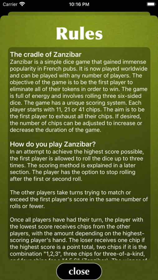 Overall, Zanzibar is an exciting and easy-to-learn game that can be enjoyed by players of all ages and skill levels. With its unique scoring system and two different variants to choose from, it's no wonder why this game has become a fan favorite all around the world.