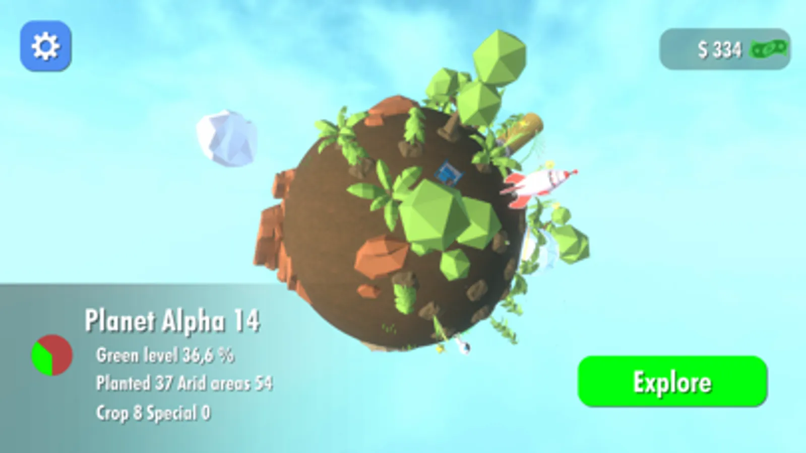 Greenify arid planets, and transform the whole environment. Walk freely on the 3D worlds, prepare the soil, select the seeds, and plant a new world. Beautiful worlds are waiting for you. All the pleasure of seeing your plants, your crops, growing and a planet transforming in a new habitable world.