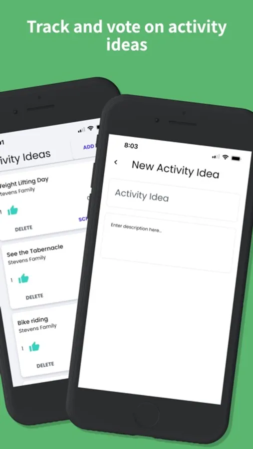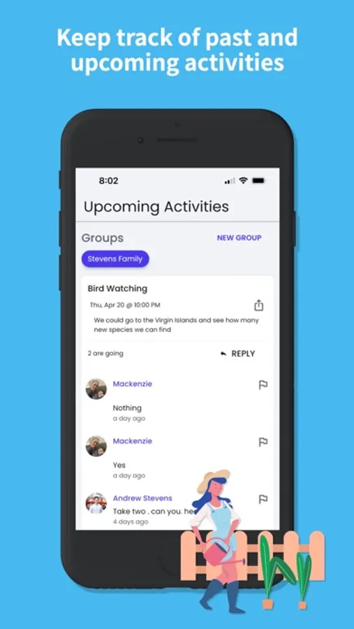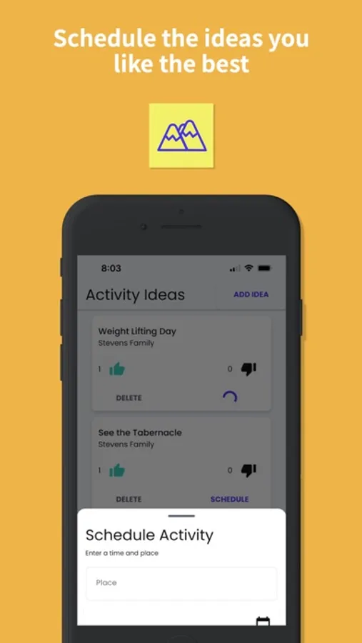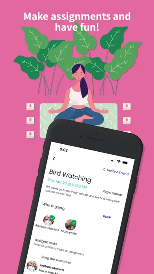 Come up with a list of activity ideas, schedule them and make assignments! This Uth Lemon Bars app makes it easy to plan out activities. You can join one or more groups with a code or create your own. You can also comment on activities and ask questions as the day gets closer.