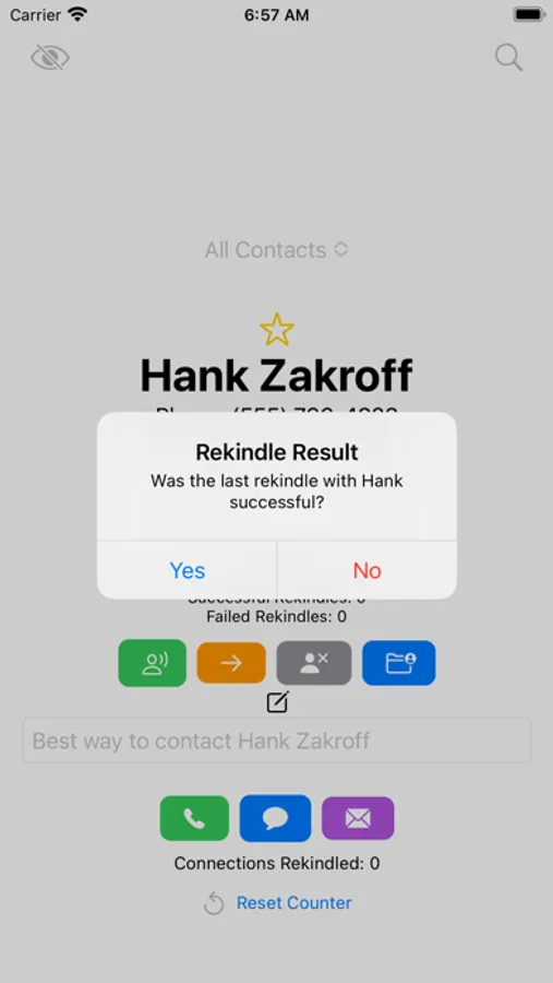 Rekindling connections: Users can increase their "Connections Rekindled" count by reaching out to the suggested contact. The app offers a confirmation prompt before marking the connection as rekindled.