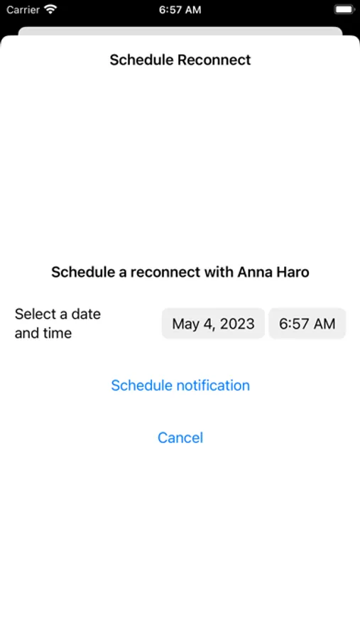 Scheduling reconnects: Users can schedule a reconnect reminder for a specific contact, ensuring that they remember to reach out to that person in the future.