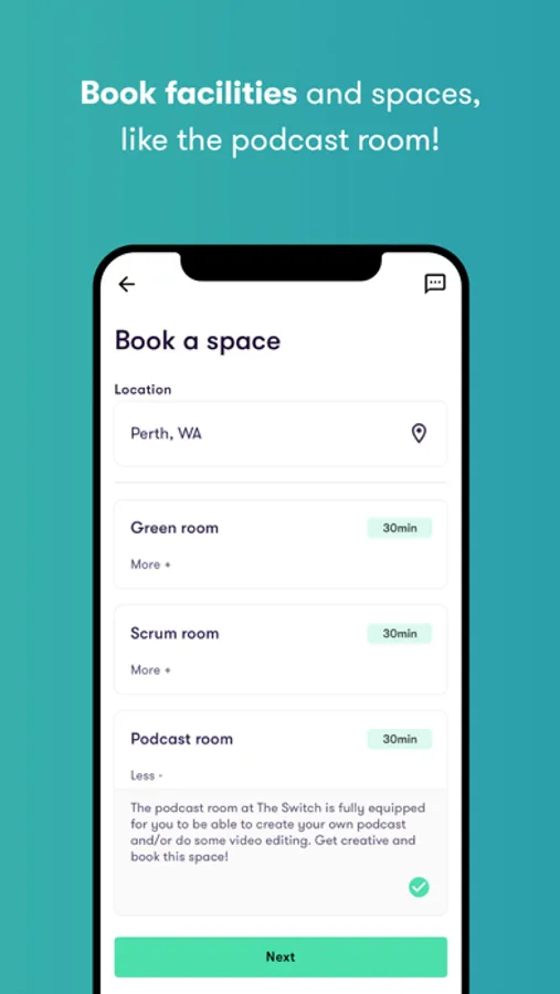 - Book a meeting room or other available common spaces for your projects, meetings or podcast sessions