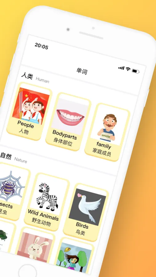 • 英语单词卡片提供20多种单词分类,超过800个单词中英文发音