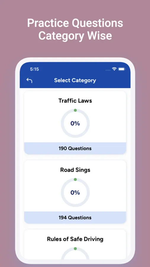 The app includes a practice module that allows to get familiar with questions that fall under different categories like Traffic Rules, Road Signs and Rules of Safe driving. It also keeps track of the progress you have made in each category. It contains questions from following categories: