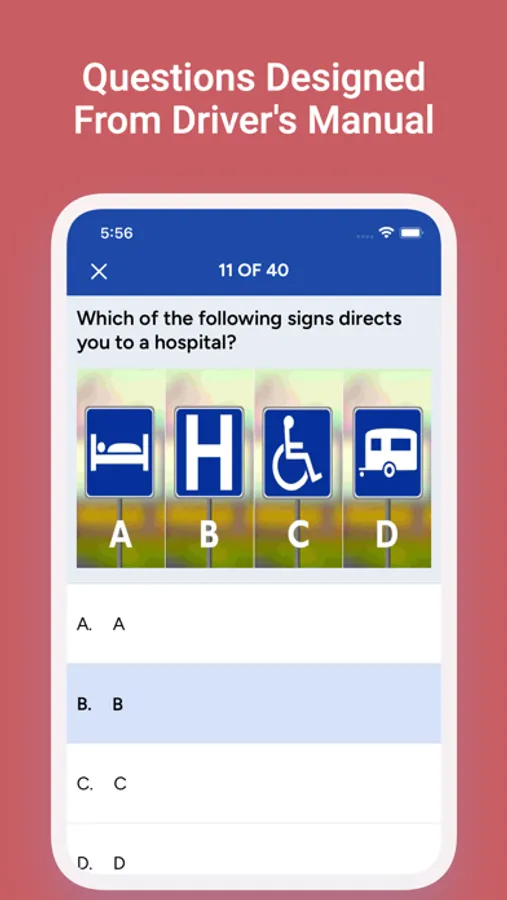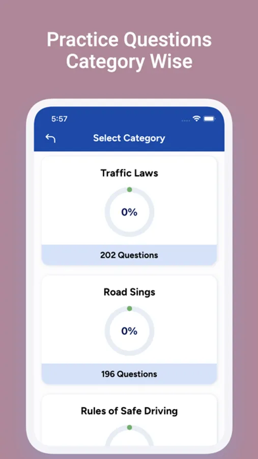 The app includes a practice module that allows to get familiar with questions that fall under different categories like Traffic Rules, Road Signs and Rules of Safe driving. It also keeps track of the progress you have made in each category. It contains questions from following categories: