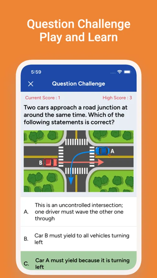 This is a unique feature of our application. It allows you learn while playing a challenge game. Your score will go up by one point each time you correctly answer a question up until the point where you get it wrong. It keeps record of your high score.