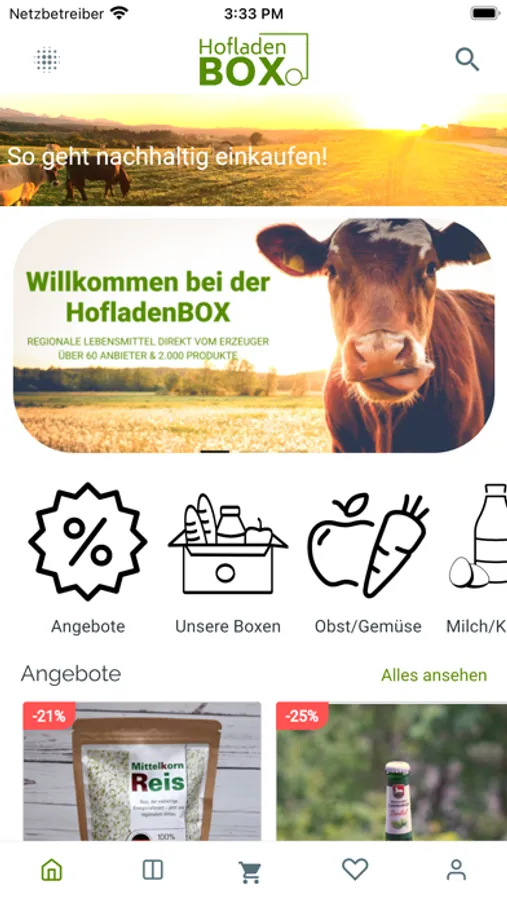 Über die HofladenBOX-App kannst du mehr als 2.000 Produkte von über 60 verschiedenen Direktvermarktern aus der Region Franken bestellen. Ohne Abopflicht oder Mindestbestellwert. Einfach in der App deinen Einkauf zusammenstellen und zu dir nach Hause oder an eine Abholstation liefern lassen.