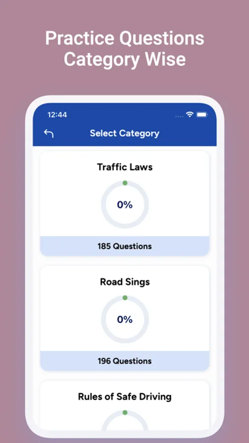The app includes a practice module that allows to get familiar with questions that fall under different categories like Traffic Rules, Road Signs and Rules of Safe driving. It also keeps track of the progress you have made in each category. It contains questions from following categories: