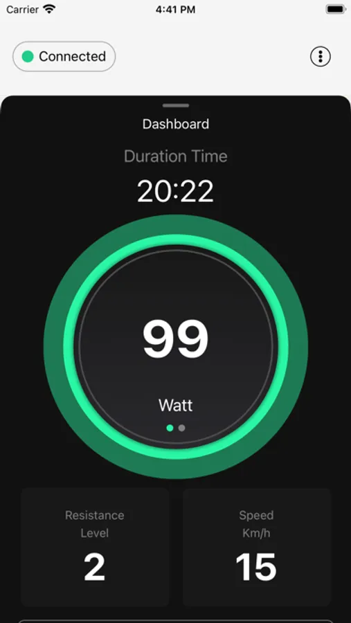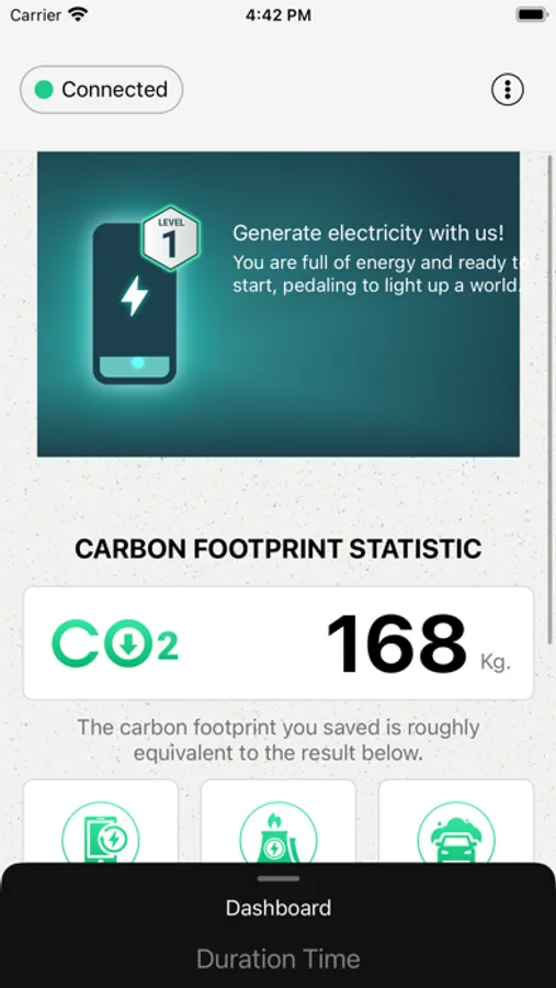 eKinekt APP showed the real-time accumulated power generation and calories by connected the device eKinekt with Bluetooth. It's also showed how many carbon emission saving for converting power generation.