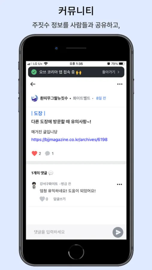 - 커뮤니티 : 수련/기술/질문/도장/대회/정보 등 다양한 주제로 전국의 주짓떼로들과 이야기를 나눠보세요! 이미지나 링크르 첨부하여 내용을 보충할 수 있습니다.