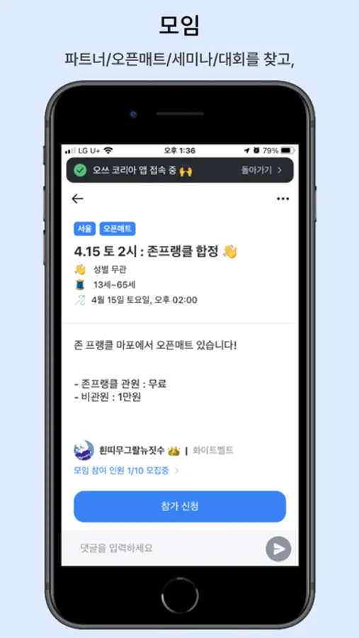 - 모임 : 파트너/오픈매트/세미나/대회 등 다양한 주제로 주짓수 모임을 만들어 보세요! 날짜, 지역, 성별, 나이 등 다양한 항목 설정이 가능합니다.