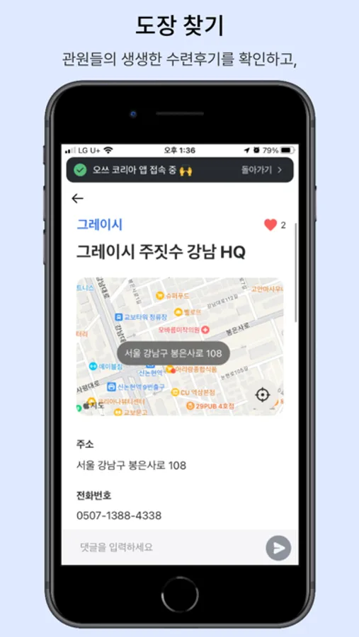 - 도장 찾기 : 현재 위치를 기반으로 가까운 주짓수 도장을 찾고, 관원들의 후기를 확인해보세요! 그레이시/스포츠/노기/종합 등 원하시는 카테고리의 도장만 조회할 수도 있습니다.