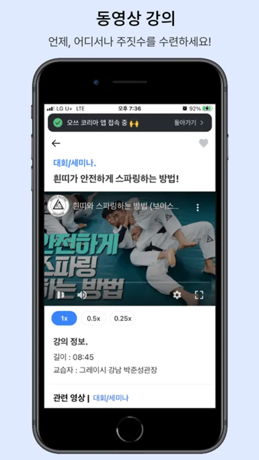 - 동영상 강의 : 이제 일상 속에서도 주짓수를 수련해보세요! 꾸준히 업데이트되는 동영상 강의를 통해 어느덧 실력이 향상되는 것을 느끼실 수 있습니다.