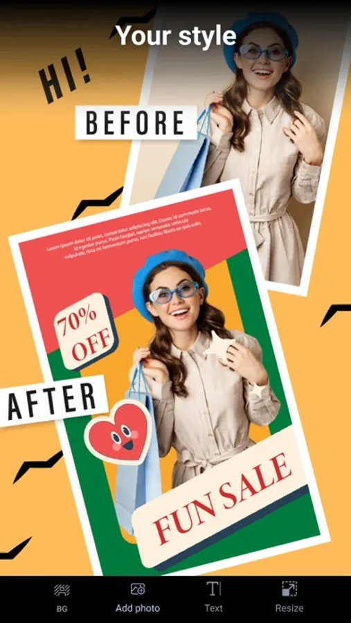 Remove background photos with AI, edit photos, use text, stickers and color effects to take your photos to the next level.