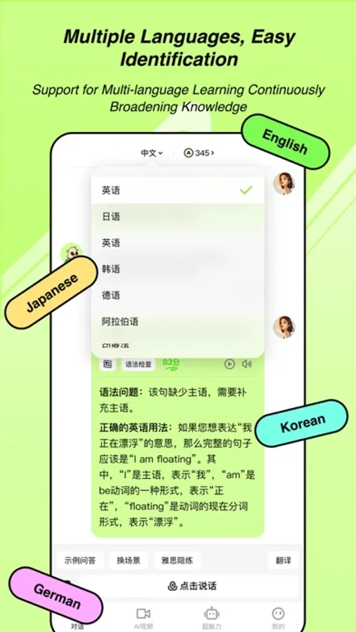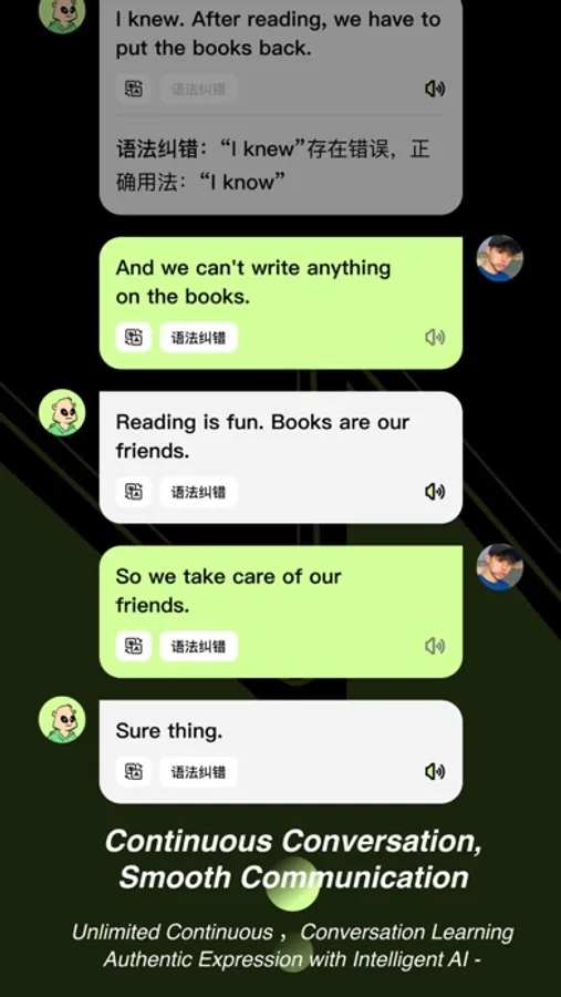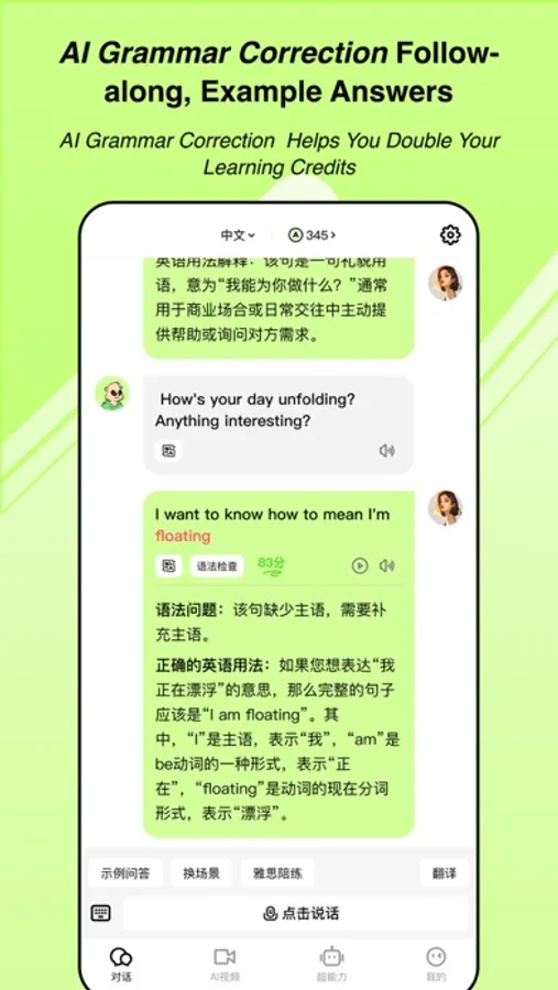 3.AI grammar correction - speak freely and the AI teacher will tell you where you went wrong.