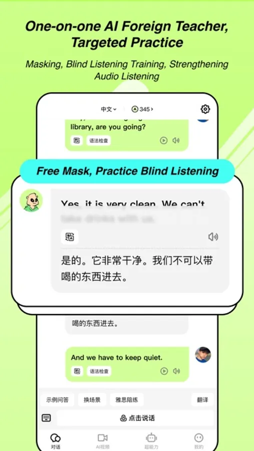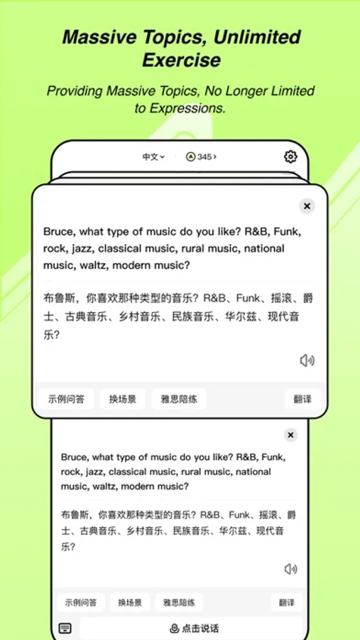 Example Q&A: If you encounter stuttering or difficulty expressing yourself during the conversation, don't panic! Our example Q&A function can provide great help. With just a tap, the software will give you the most standard and authentic example expression based on your voice input, guiding you to find the perfect answer.