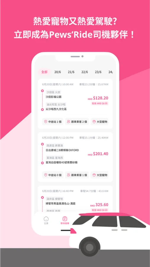 簡單幾步註冊成為Pews’Partner司機夥伴,隨時接載寵物朋友出遊、聚會、郊遊等等, 以短短的車程,陪他們走過一趟難忘旅程! 公司背景 Pews’Ride 於 2023年成立,由一班喜愛寵物主子的團隊組成,希望改善現時寵物出行會遇到的情況,為一眾主子們提供多一個更好的選擇。Pews’Ride的車款暫時有「Pews’Ride Go」普通客貨車以及「Pews’Ride Plus」商務客貨車兩種選擇。只要有需要與寵物主子出遊,「去邊都好,Pew一聲就到!」 為何要成為Pews’Partner司機夥伴? 如果您既熱愛駕駛又喜愛寵物,立刻加入我們成為 Pews’Partner 司機夥伴!完善的App功能,除了可以隨時接載不同類型的寵物朋友,更可以隨時Online接單,賺取額外收入,為您的工作加添不少樂趣!