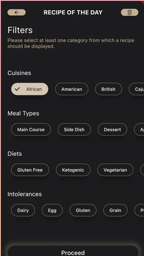 The main functionality of Recipe of the Day is the ability to generate a random recipe based on your selected parameters. Simply select your desired cuisine, meal type, diet, and intolerance, and let the app surprise you with a delicious recipe!