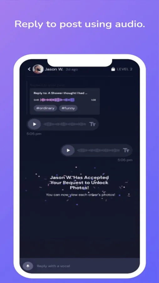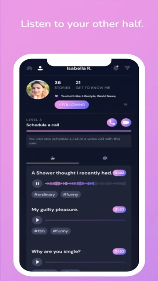 * Audio Profiles: Listen to audio introductions from members before deciding to match with them.