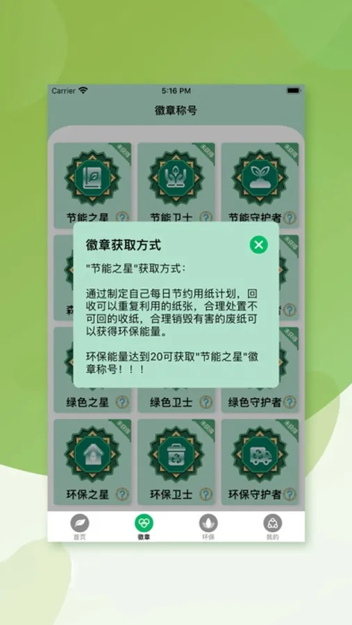 帮助每个热爱环保的人建立自己的环保回收小仓库,通过获得环保能量换取徽章,成为一名合格的环保绿色小卫士。