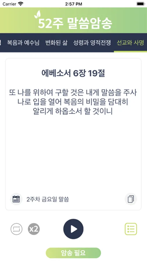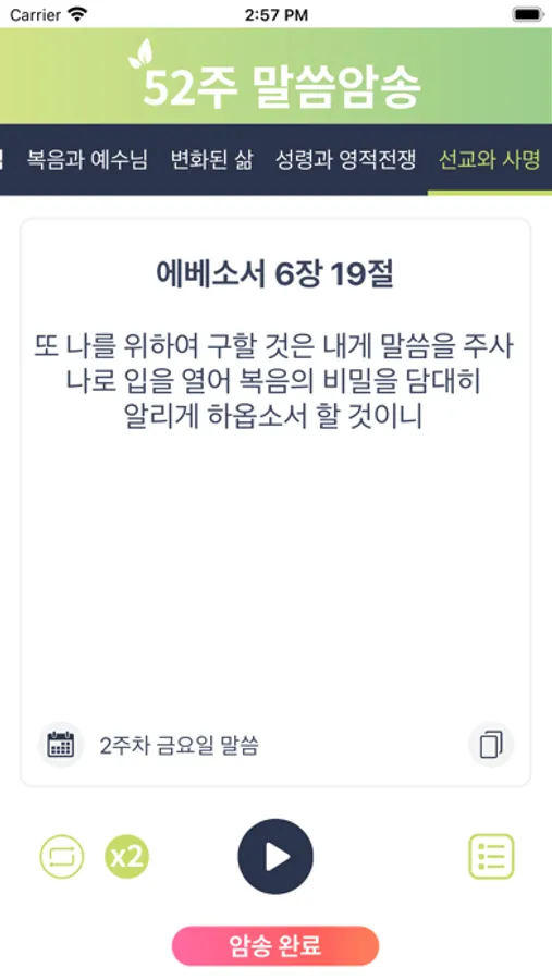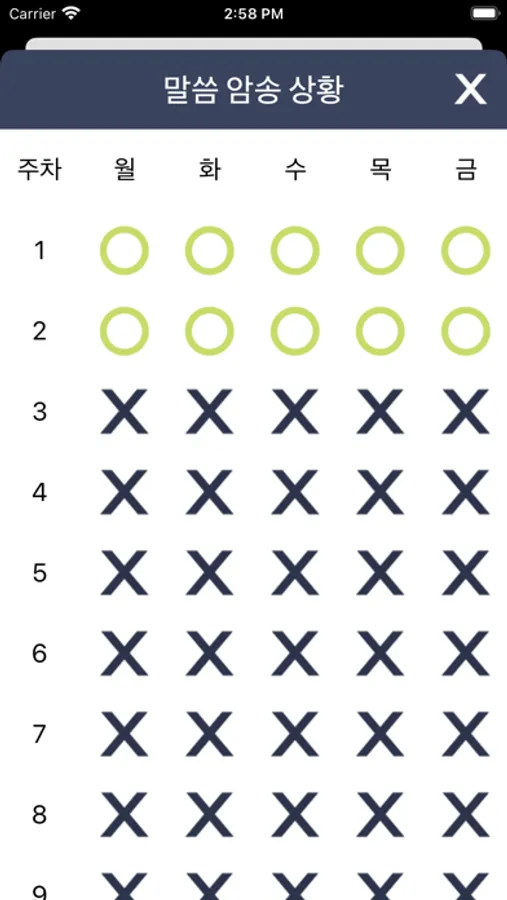 매일의 말씀을 반복적으로 듣고 암송한 것을 개인별로 체크하는 기능입니다