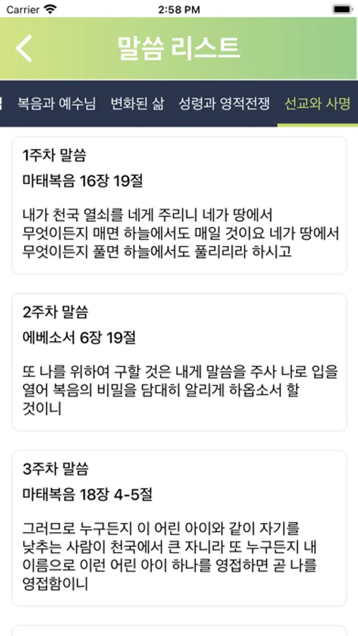 1년 52주 동안의 말씀을 날짜별, 주제별로 볼 수 있는 기능으로 말씀의 흐름을 알 수 있습니다