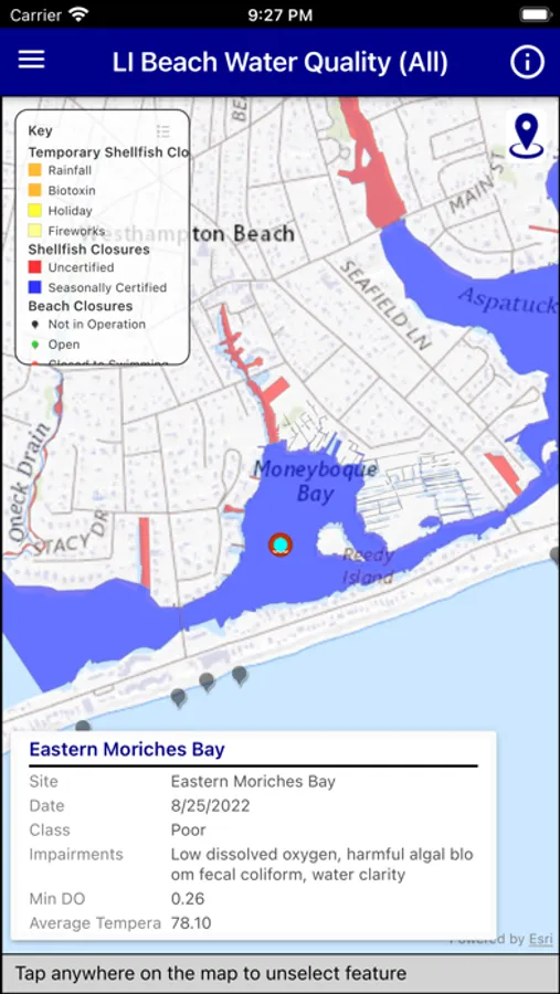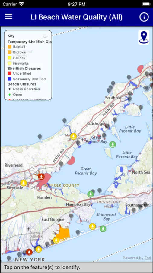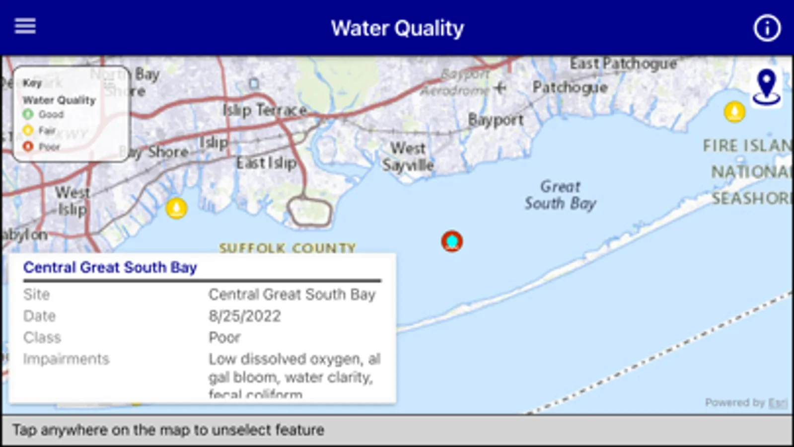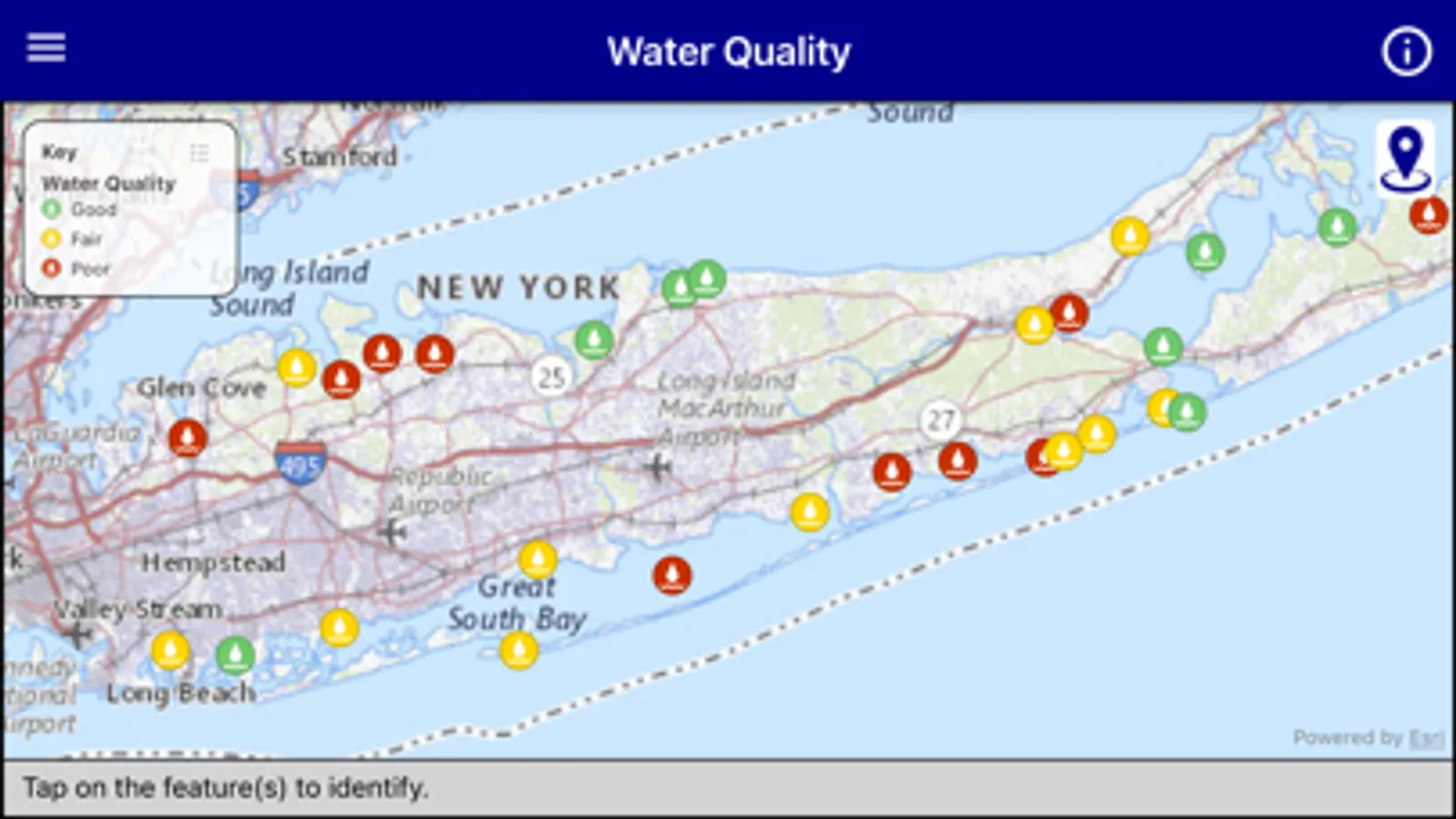 This is a mobile mapping application presenting up-to-date beach, shellfishing, and water quality of Long Island by integrating information from: 1) the water quality index data collected by SoMAS Gobler Lab at Stony Brook University, 2) beach closures from the New York State Department of Health, and 3) shellfish closures from the New York State Department of Environmental Conservation.