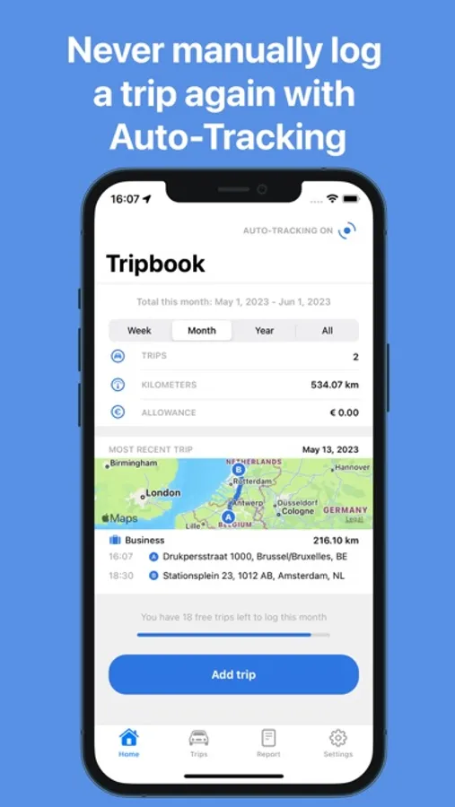 ▶ COMPREHENSIVE REPORTING: Generate detailed reports (XLS, CSV or PDF) of your trips with Tripbook. The app provides comprehensive reporting capabilities, allowing you to gain valuable insights into your travel patterns and mileage for tax purposes or expense reimbursement.