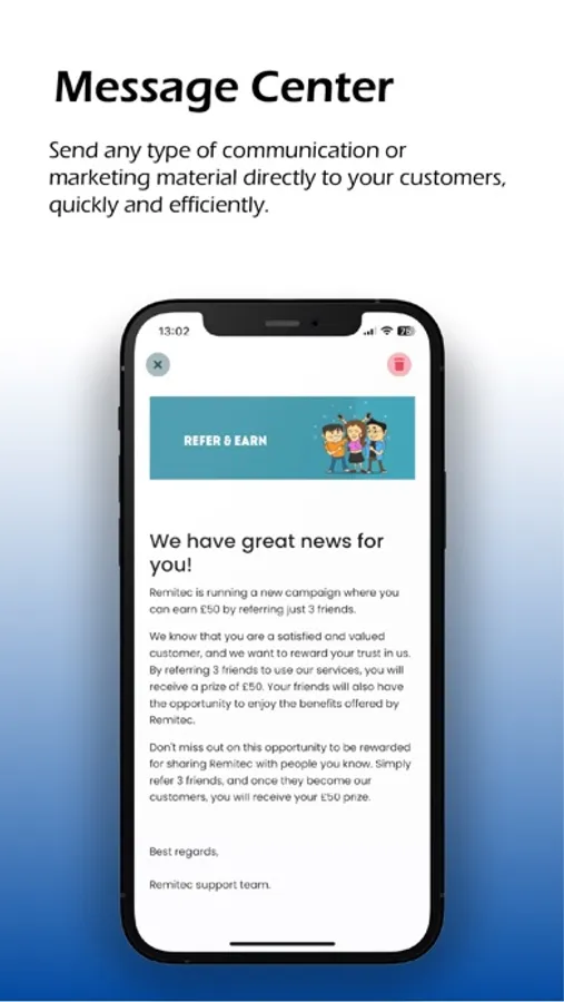 We understand the importance of effective communication with your customers. That's why Remitec offers an integrated Message Center, enabling you to connect and communicate with your customers easily and conveniently. Send updates about remittances, provide personalized support, or simply keep your customers informed about the latest news - all in one place.