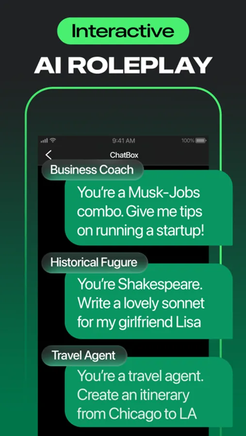 With all my AI powers, I can be who you want me to be! Need some practice for your next job interview? I'll be your ruthless interviewer. Puzzled by taxes? Count on me to act as your trusted accountant! Is your relationship on the rocks? Let me be your virtual love guru! Want to hang out with some legendary icons? I can be anyone, from Founding Father Benjamin Franklin to the iconic and glamorous Marilyn Monroe!