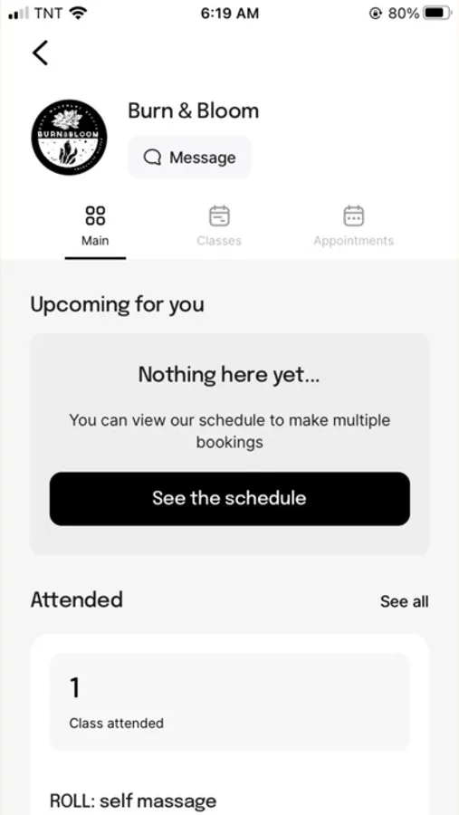 The Burn & Bloom app makes it very easy for you to manage your Burn & Bloom account, book into our classes and events, watch our on-demand content, and keep in touch with us. You can easily message us if you have a question or want to share something with them. You can also follow our public feed to see any announcements we make, promos we run, or content we share.