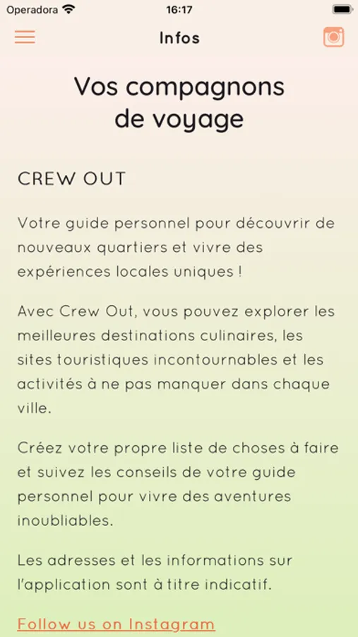 Crew Out : votre guide personnel pour découvrir de nouveaux quartiers et vivre des expériences locales uniques ! Avec CrewOut, vous pouvez explorer les meilleures destinations culinaires, les sites touristiques incontournables et les activités à ne pas manquer dans chaque ville. Créez votre propre liste de choses à faire et suivez les conseils de votre guide personnel pour vivre des aventures inoubliables. Que vous soyez en vacances ou en voyage d'affaires, Crew Out vous aide à découvrir les meilleurs quartiers et les activités à faire. Téléchargez l'application dès maintenant pour vivre des expériences inoubliables dans chaque ville que vous visitez !