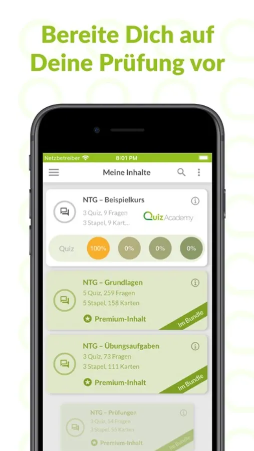 QuizAcademy bietet Dir in dieser App alle grundlegenden Basisinhalte im Bereich der naturwissenschaftlichen und technischen Gesetzmäßigkeiten. Der NTG Trainer begleitet Dich gezielt bei der Prüfungsvorbereitung und bereitet die auf die fachrichtungsübergreifende Basisqualifikation vor.