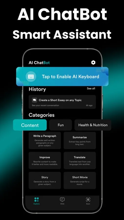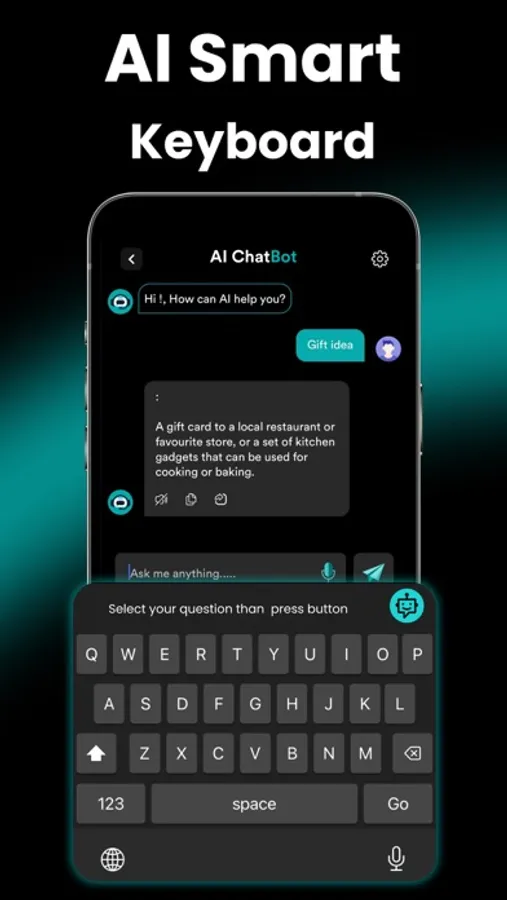Not only do you get access to unlimited knowledge and writing help, but here you can skyrocket your productivity with features like tap-to-copy answers, text-to-speech, chat history, AI keyboard, and more!