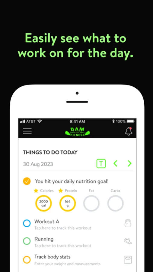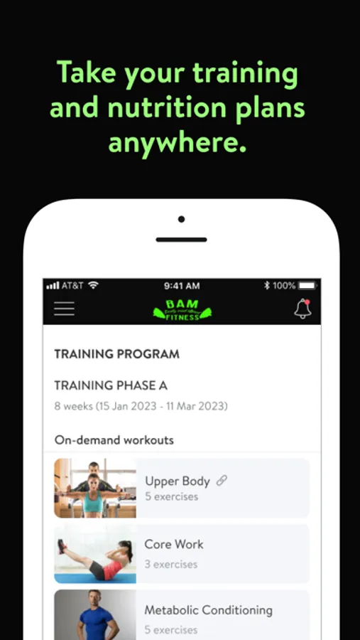 With the BAM Fitness App, you will have access to workout programs designed specifically to help you reach your fitness and health goals! You can follow & track your workouts, your nutrition, your lifestyle habits, measurements and results–all with the help of your coach.