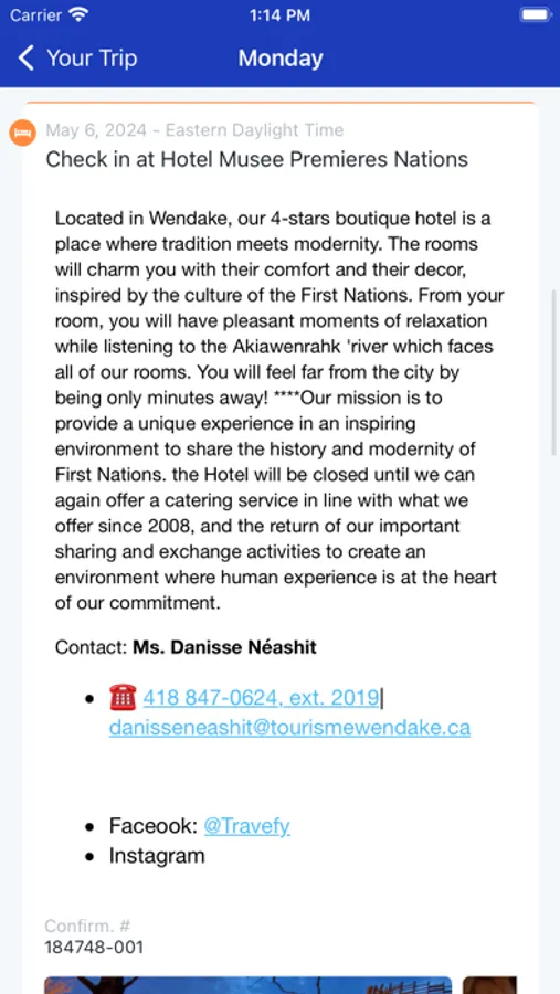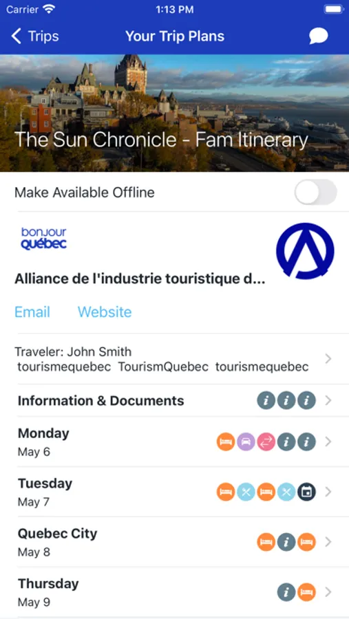 The Quebéc app lets you view your itinerary on your phone anytime and anywhere. It’s super easy to use, looks great and makes all of those little trip details easy to find and understand. You don’t even need data or an Internet connection.