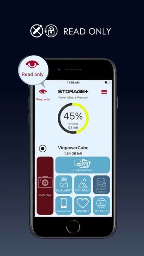 You can record 4K videos and take photos using the built-in BackupBOT camera function. The videos and photos will be saved directly to the BackupBOT drive, saving precious memory and not occupying any memory on your iPhone, iPad, iPod.